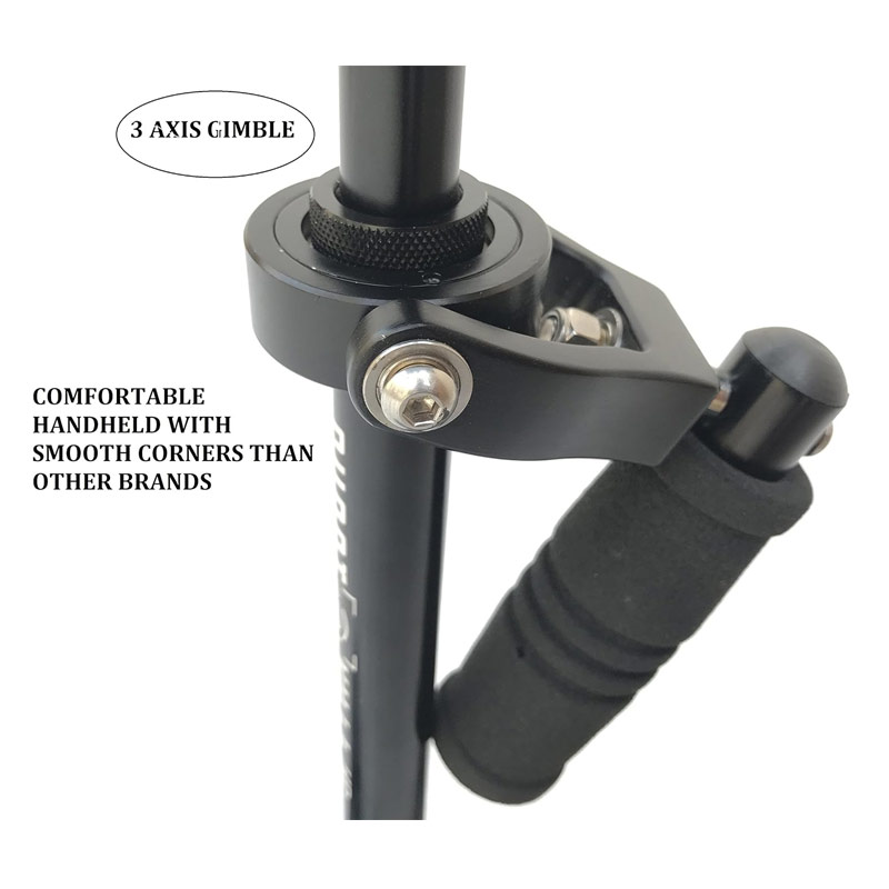 - Handle Grip is attached to a free floating, three axis Gimbal. This allows your hand to move up and down, and side-to-side freely. The gimbal has ball bearings for smooth rotational camera control with easy ‘on axis’ movement.