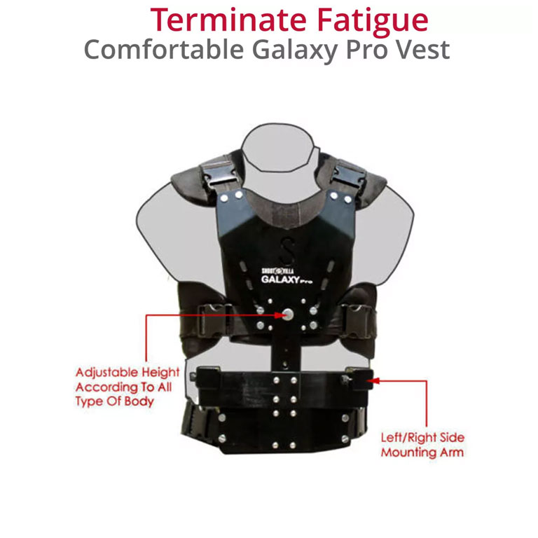 Using handheld stabilizer during entire weddings, or sporting events or theatrical performances can put strain on your arms, even with lighter cameras. The Galaxy arm & vest reduces your fatigue by distributing the weight of the equipment uniformly over the shoulder & back. The dual spring arm adds an extra level of stability to a handheld stabilizer while enabling you to pivot, pan and boom smoothly and quietly.