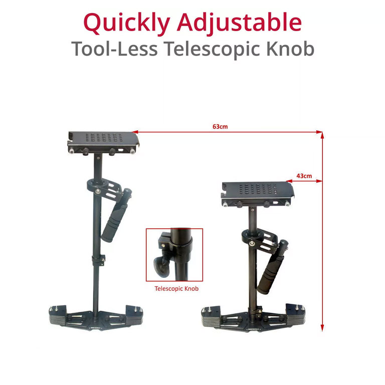 The camera platform moves front and back also side by side. Vary the counter weights on the base platform and adjust the camera vertical balance. Now camera is ready to take into action.Fast assembling than other handheld stabilizers.