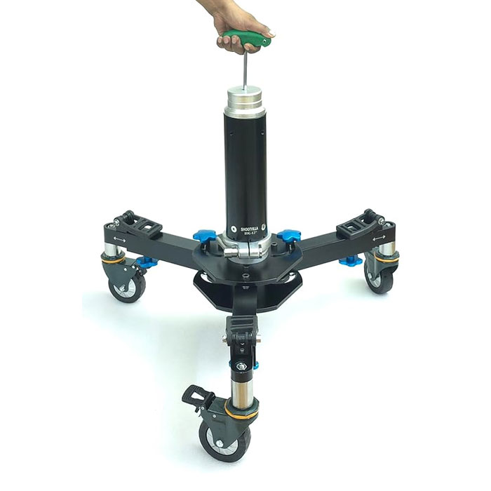 Aluminium Constructed Dolly This dolly is constructed with Hi-grade Aluminum which makes it lightweight and durable as well. It allows you to work with heavy setups and can take payload up to 450kg/900lb. Tripod Compatibility This dolly is designed for use with Heavy-Duty Tripods having twin spiked feet or Rubber feet. Secure tripod mounting has been made easier & quicker with the Tripod feet holder. Immense Smoothness with Wheels High Quality Urethane Floor Wheels of this portable dolly ensure extra smoothness. The Locks on the wheels ensure static jerk free shots. Quick & Easy Setup This heavy duty Dolly comes fully assembled, saving your production time. Bazooka Set with safety lock Well-made Heavy Duty Euro/Elemac Base Bazooka System in Various Sizes which are Expandable to Suit Different Jobs and with safety lock
